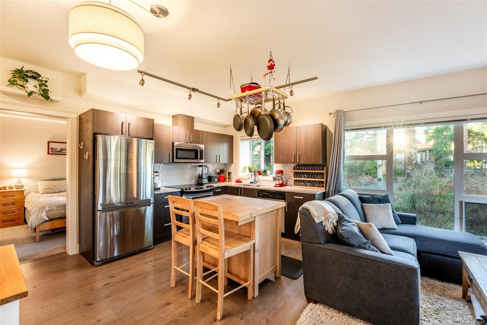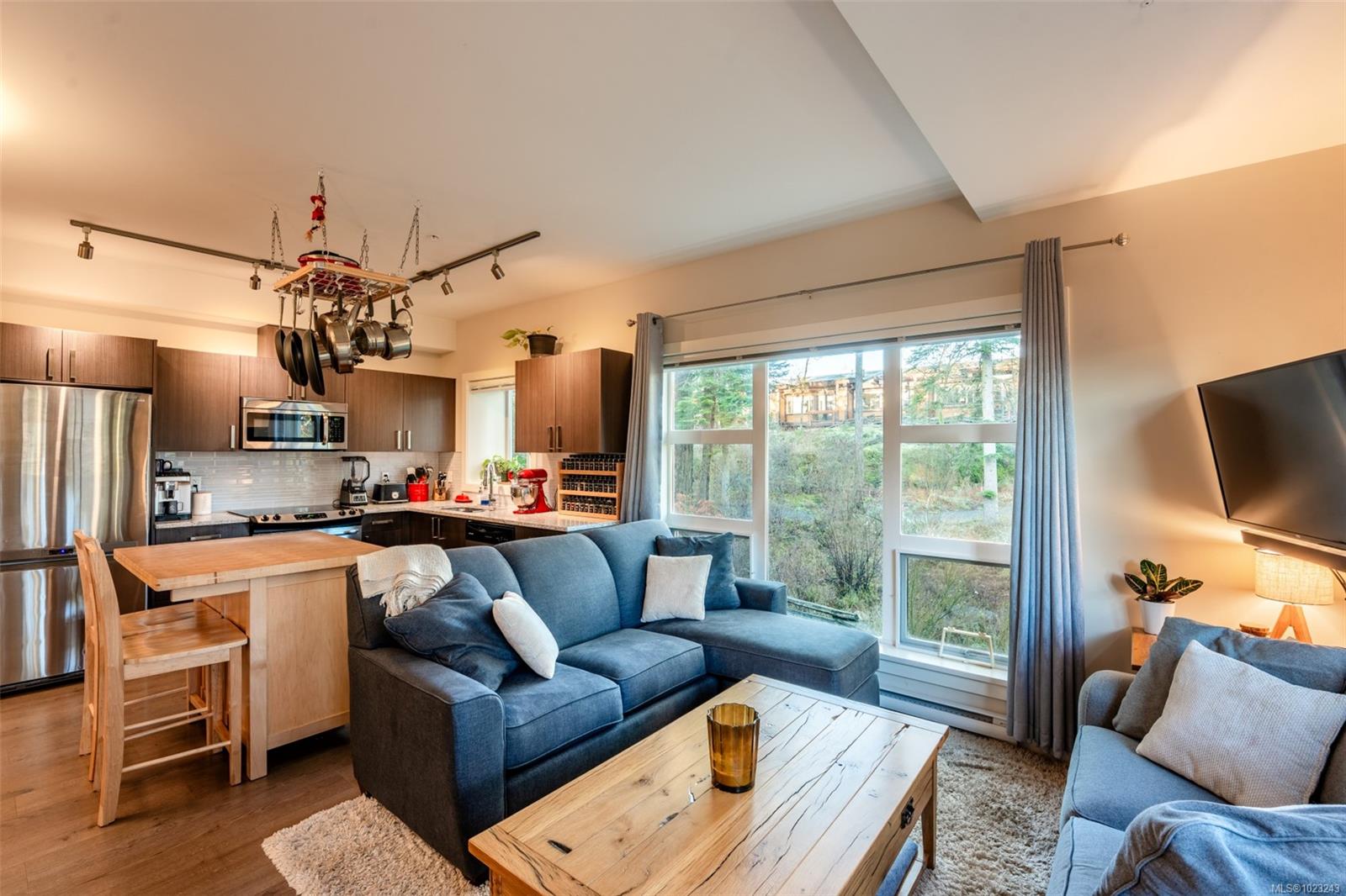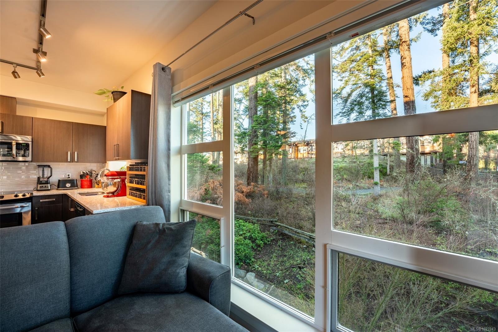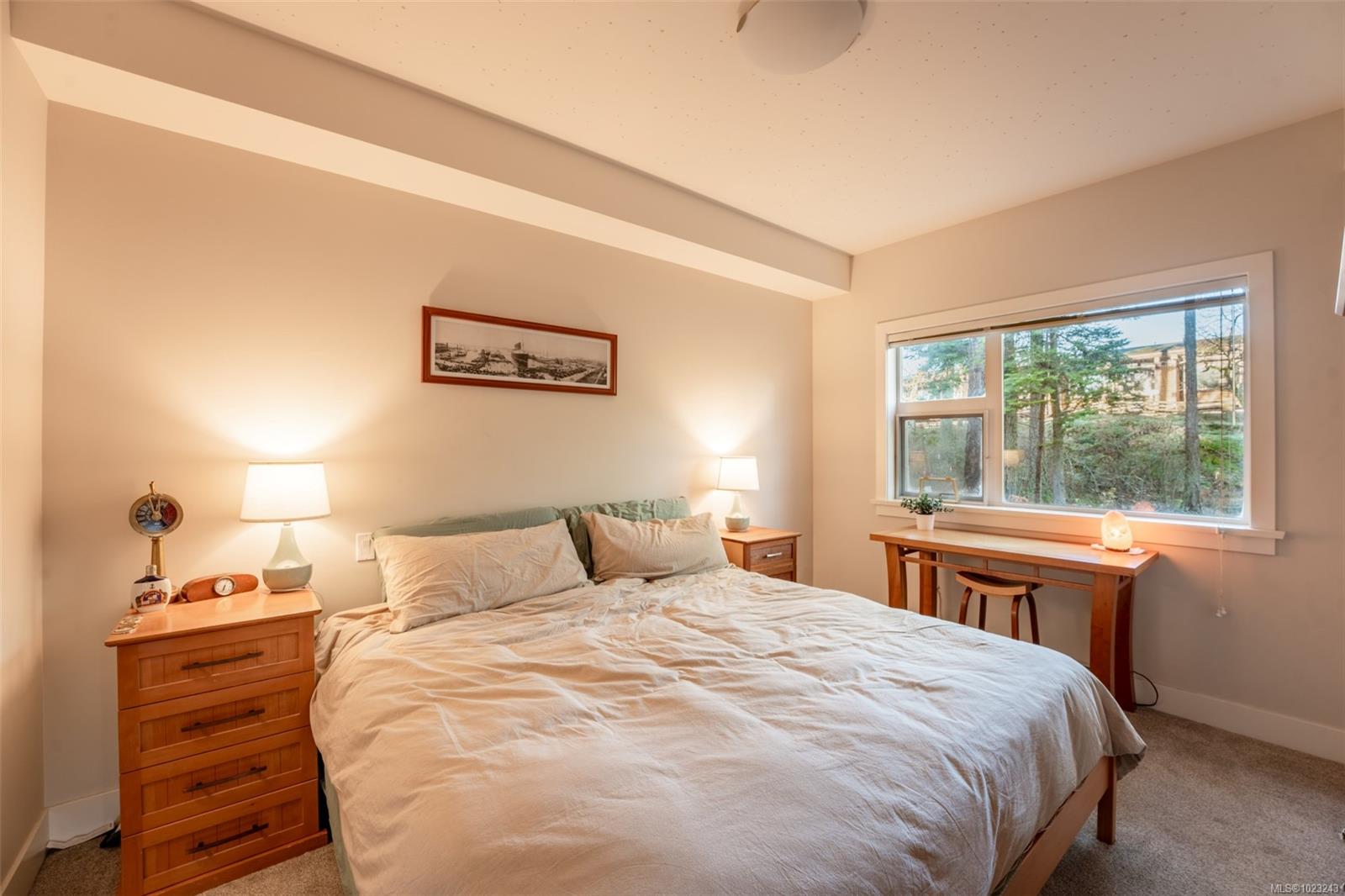 Quiet, park-side and surrounded by mature trees and municipal parkland, this peaceful, pet-friendly 2-bed, 2-bath corner suite offers a rare blend of nature, privacy, and modern comfort, like a private retreat with everyday convenience. Inside, the sleek kitchen features stone countertops, modern cabinetry, and abundant natural light. Over-height ceilings enhance the sense of space, and the layout places bedrooms on opposite sides of the suite, ideal for families, guests, or shared living. The exceptionally large second bedroom with generous closet space adds flexibility rarely found in condos of this size. Heated bathroom floors, a custom-fit AC unit, in-suite laundry, ample storage, and a large private balcony overlooking greenery add to the home’s livability. Extras include one oversized underground parking stall, storage locker, secure bike storage, and a well-managed strata. Located steps to Eagle Creek shopping, schools, hospital, transit, and trail access.