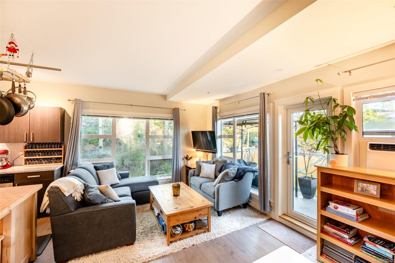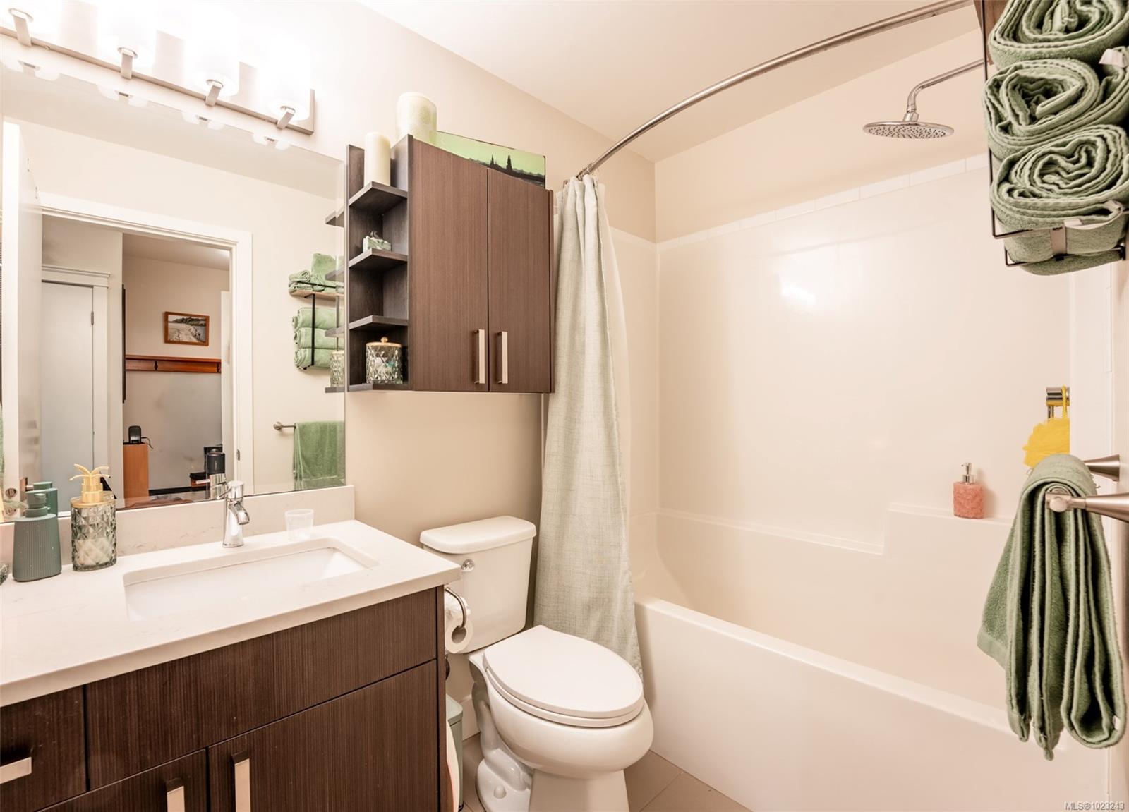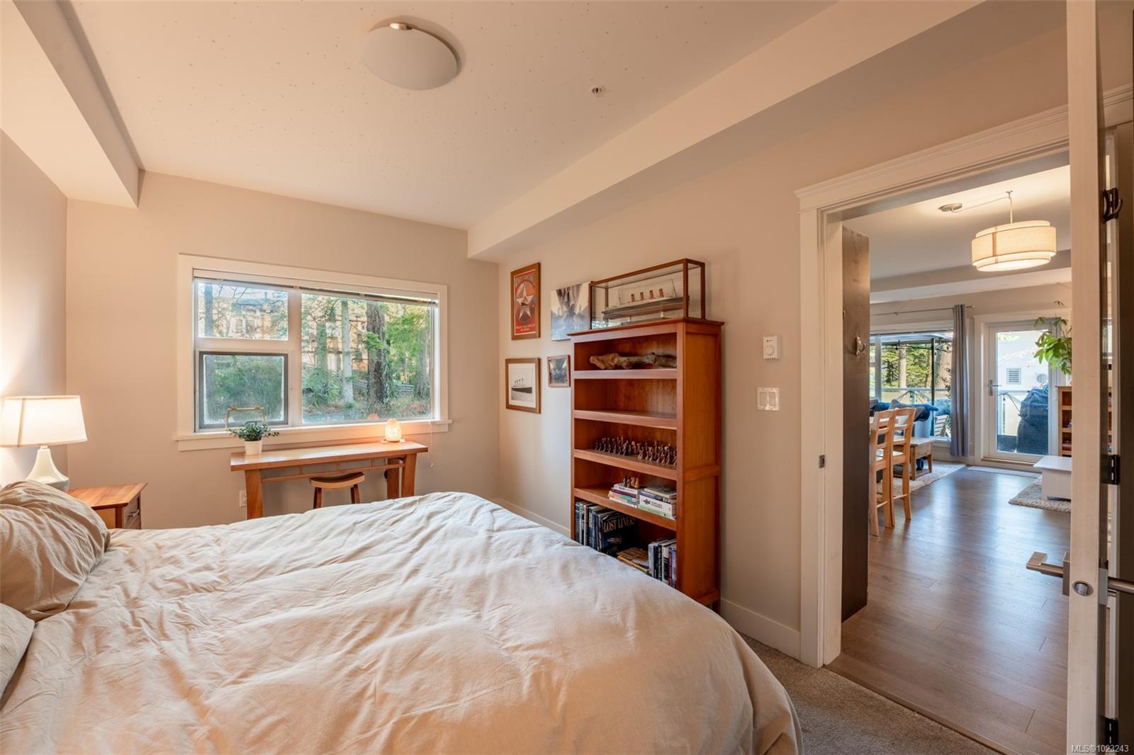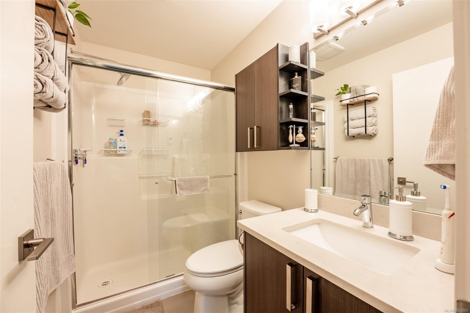 Quiet, park-side and surrounded by mature trees and municipal parkland, this peaceful, pet-friendly 2-bed, 2-bath corner suite offers a rare blend of nature, privacy, and modern comfort, like a private retreat with everyday convenience. Inside, the sleek kitchen features stone countertops, modern cabinetry, and abundant natural light. Over-height ceilings enhance the sense of space, and the layout places bedrooms on opposite sides of the suite, ideal for families, guests, or shared living. The exceptionally large second bedroom with generous closet space adds flexibility rarely found in condos of this size. Heated bathroom floors, a custom-fit AC unit, in-suite laundry, ample storage, and a large private balcony overlooking greenery add to the home’s livability. Extras include one oversized underground parking stall, storage locker, secure bike storage, and a well-managed strata. Located steps to Eagle Creek shopping, schools, hospital, transit, and trail access.