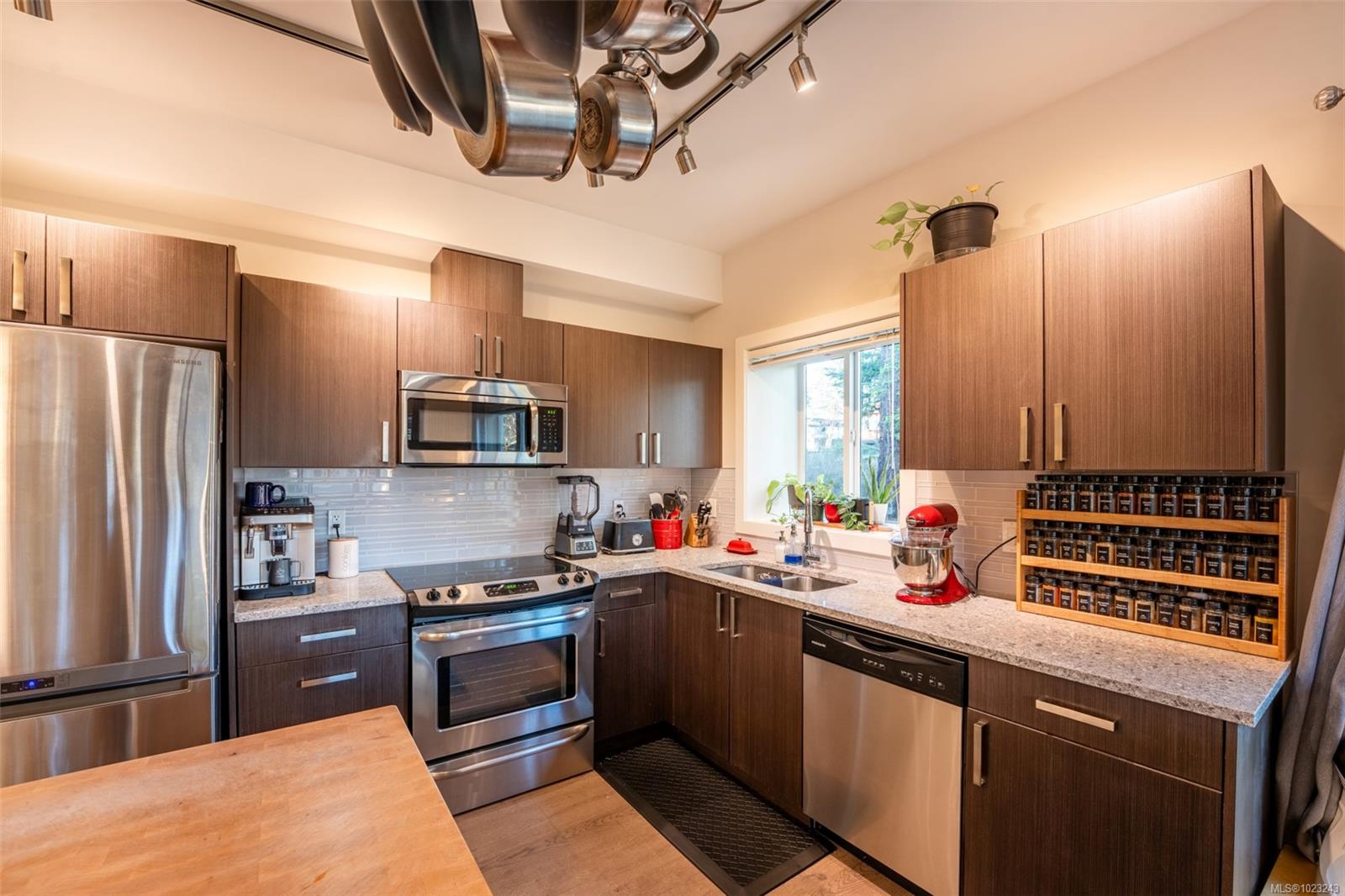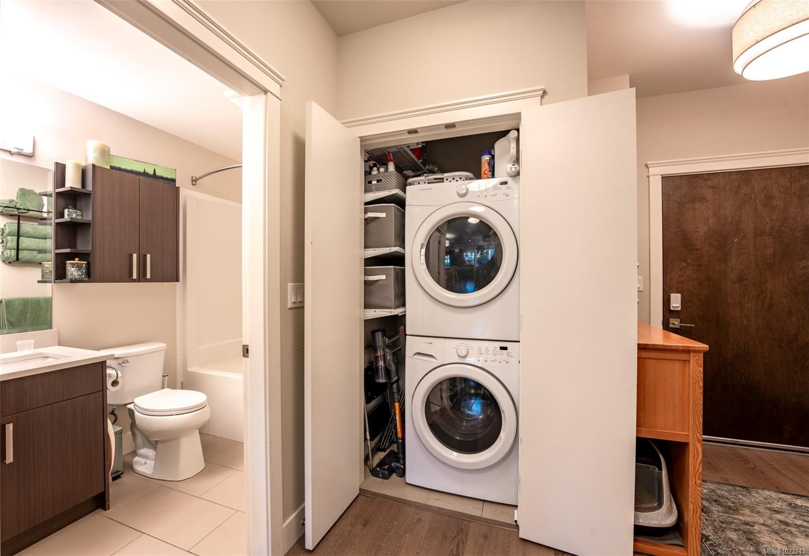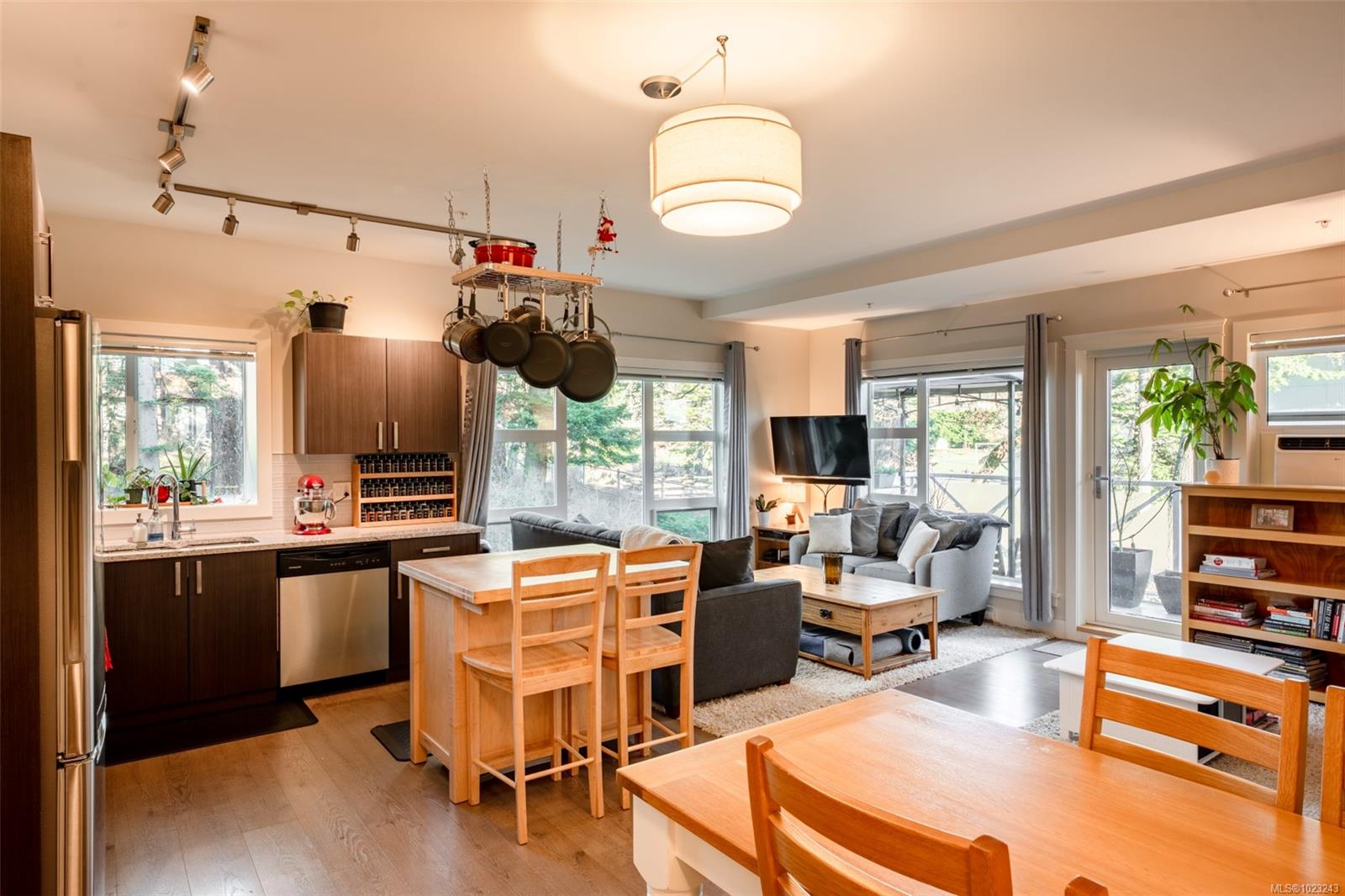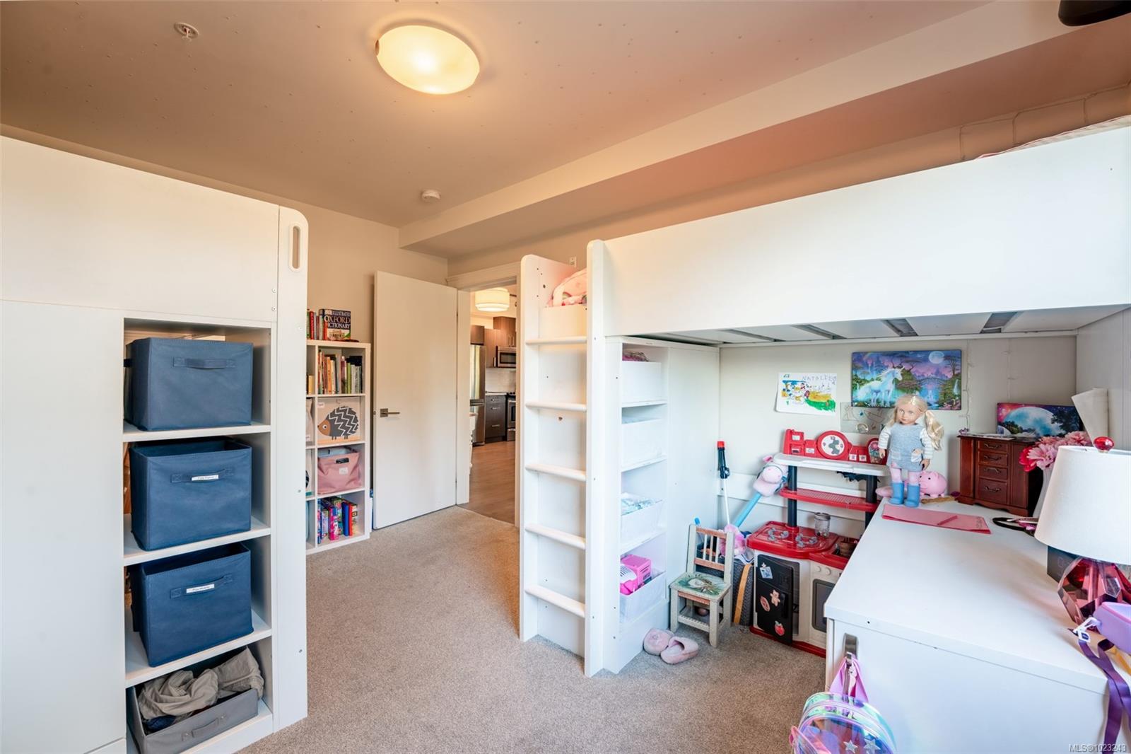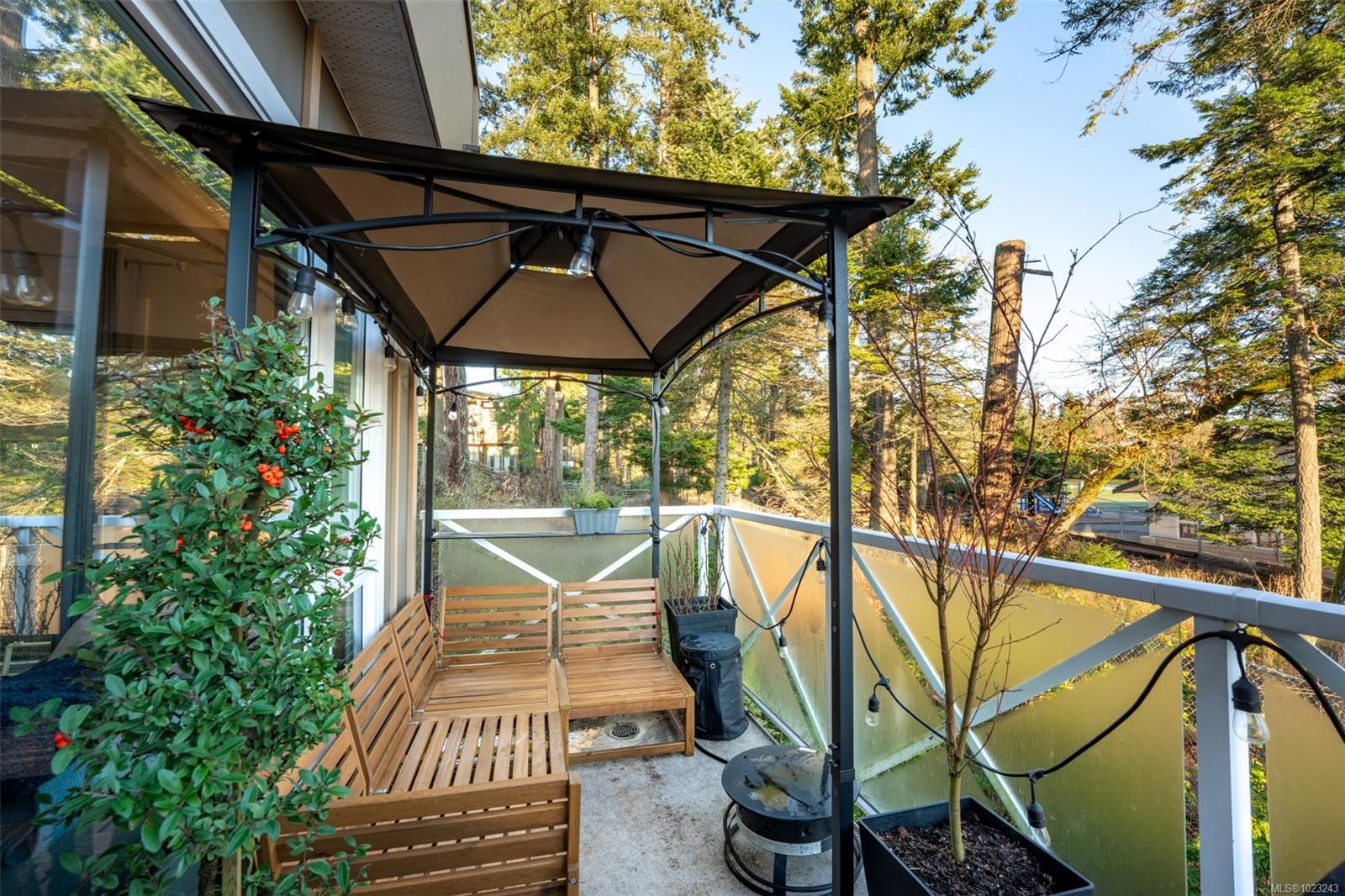 Quiet, park-side and surrounded by mature trees and municipal parkland, this peaceful, pet-friendly 2-bed, 2-bath corner suite offers a rare blend of nature, privacy, and modern comfort, like a private retreat with everyday convenience. Inside, the sleek kitchen features stone countertops, modern cabinetry, and abundant natural light. Over-height ceilings enhance the sense of space, and the layout places bedrooms on opposite sides of the suite, ideal for families, guests, or shared living. The exceptionally large second bedroom with generous closet space adds flexibility rarely found in condos of this size. Heated bathroom floors, a custom-fit AC unit, in-suite laundry, ample storage, and a large private balcony overlooking greenery add to the home’s livability. Extras include one oversized underground parking stall, storage locker, secure bike storage, and a well-managed strata. Located steps to Eagle Creek shopping, schools, hospital, transit, and trail access.